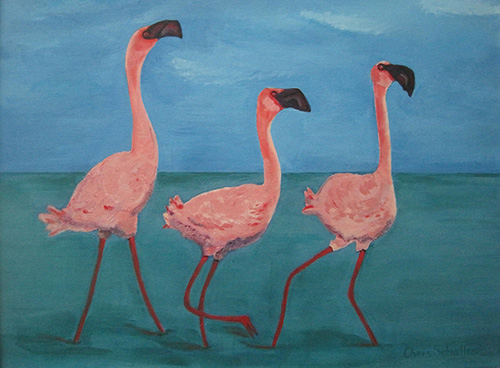 - THREE PINK FRIENDS Acrylic on canvas board 18″W x 14″H (framed silver metal) Original $75